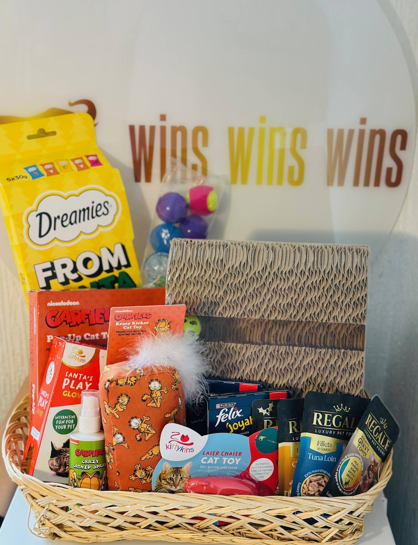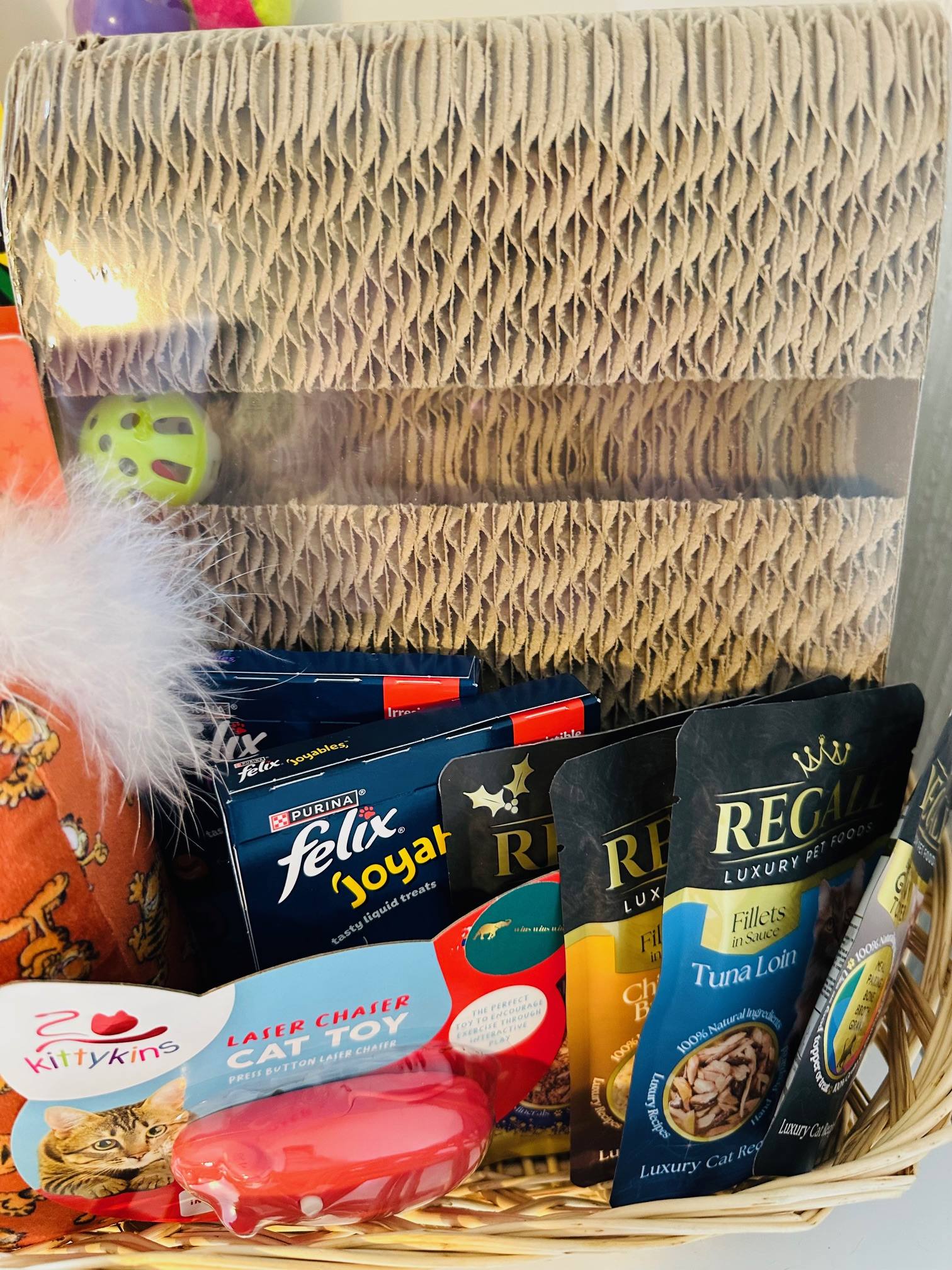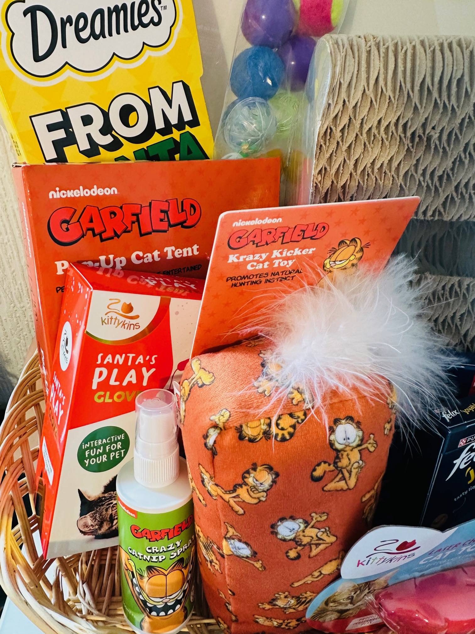 Hereโs whatโs inside: ๐ Dreamies cat stocking ๐๏ธ Garfield pop-up cat tent ๐งค Play glove toy ๐งธ Garfield cat toy ๐ฟ Garfield catnip spray ๐บ Pyramid cat scratcher ๐ฆ Laser cat toy ๐ 2 x Flexi Joyables treats ๐ฅ 4 packs of Regal Luxury cat food ๐ Toy collection for endless playtime
